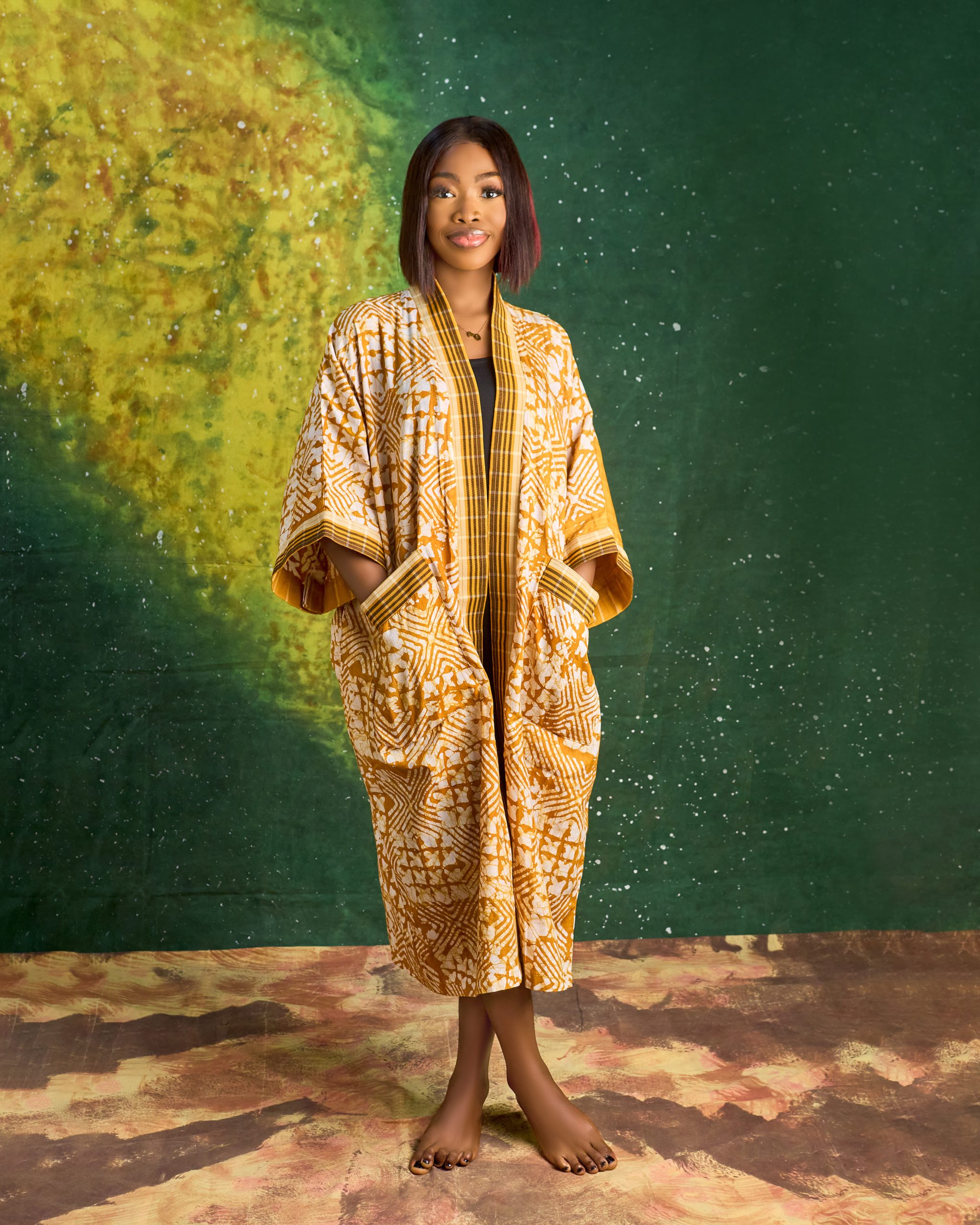 Introducing the Golden Horizon Kimono – a collection inspired by the radiance of the setting sun, where the golden hour meets sustainable luxury. Handcrafted from Adire and Aso Oke, this kimono is a fusion of tradition, elegance, and eco-conscious design.